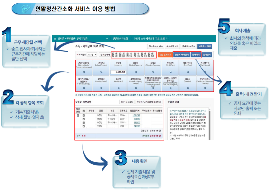 • 24년 1월 20일 ~ 2월 28일 : 소득공제, 세액공제 자료수집 및 제출 / 원천징수 영수증 발급
