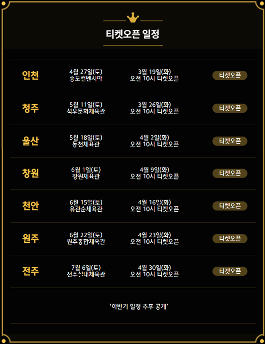 '2024 고마웠습니다-라스트콘서트'는 전국 투어 콘서트로 진행되며, 5월부터 7월까지 다양한 지역에서 공연이 예정되어 있습니다. 예매는 각 지역의 공연장에서 진행될 예정이며, 예매 일정과 가격은 추후 공개될 예정입니다.