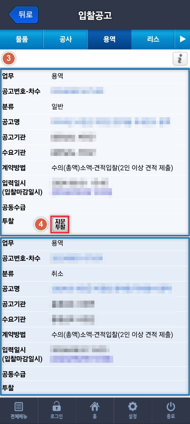 3. 입찰 건을 확인(③)하고 투찰대상 항목에 '투찰' 버튼(④)을 누릅니다