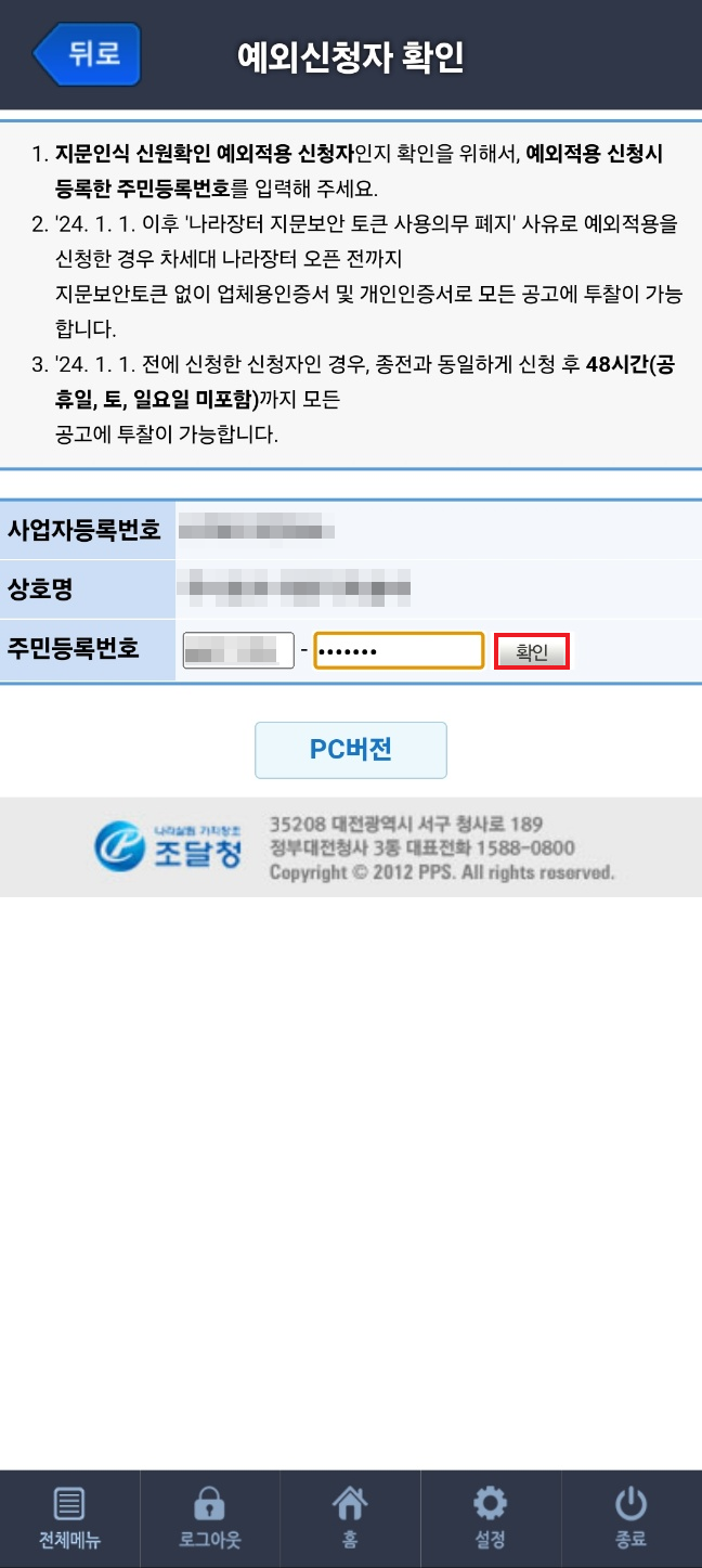 7. 업무절차는 PC와 동일합니다. 「예외신청자 확인」 페이지에서 '예외신청자 주민등록번호' 입력 후 확인을 누릅니다.
