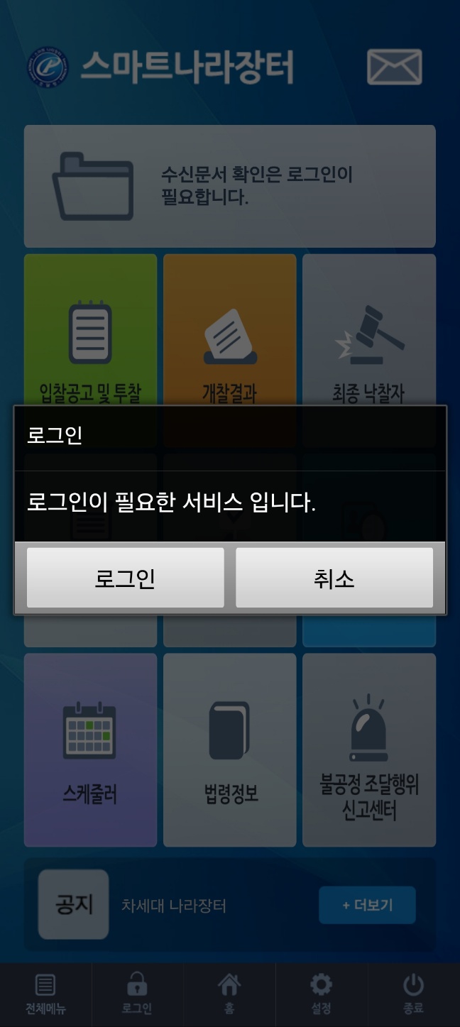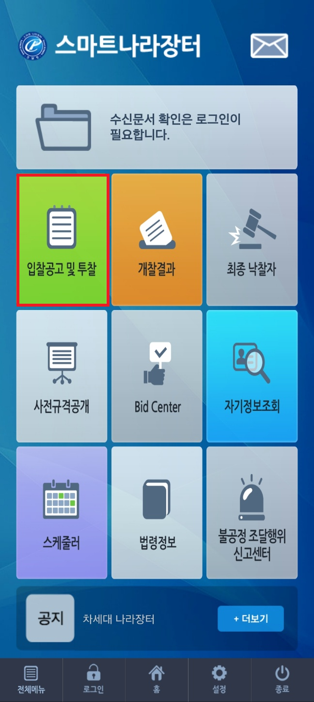 1. 「스마트 나라장터」 앱을 설치하고 실행합니다.