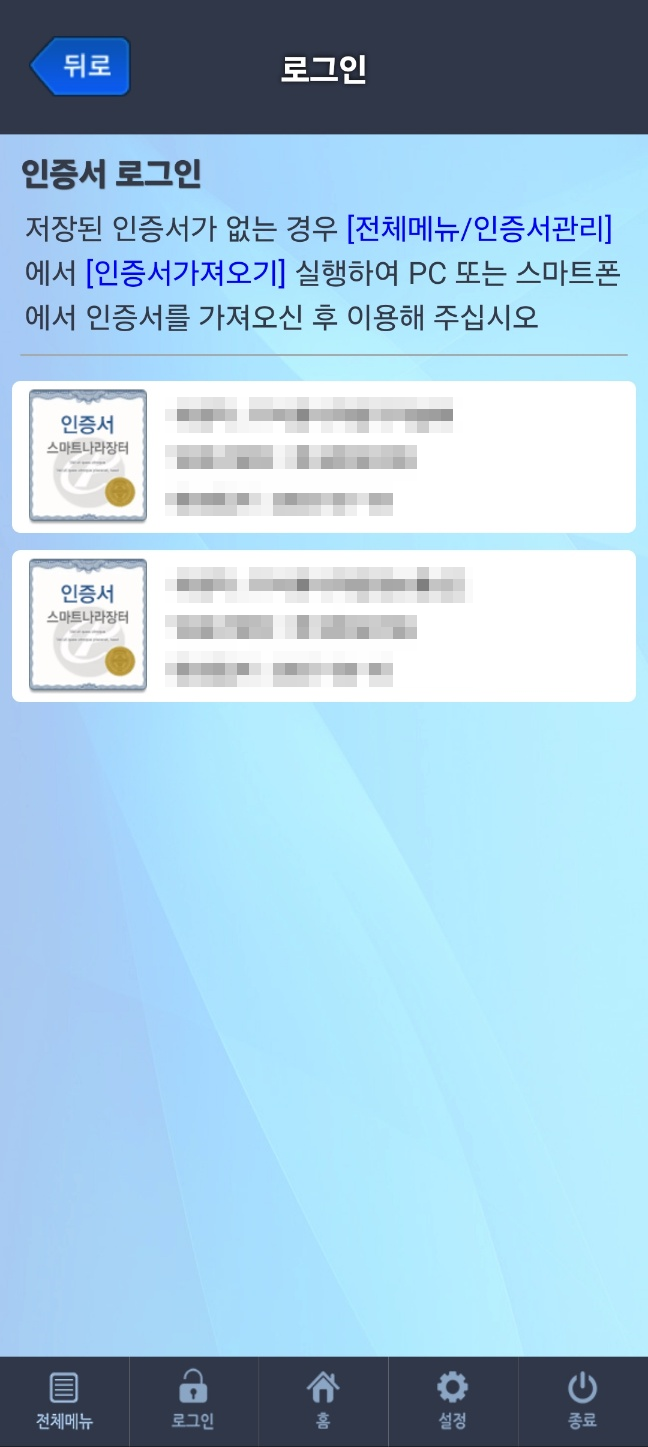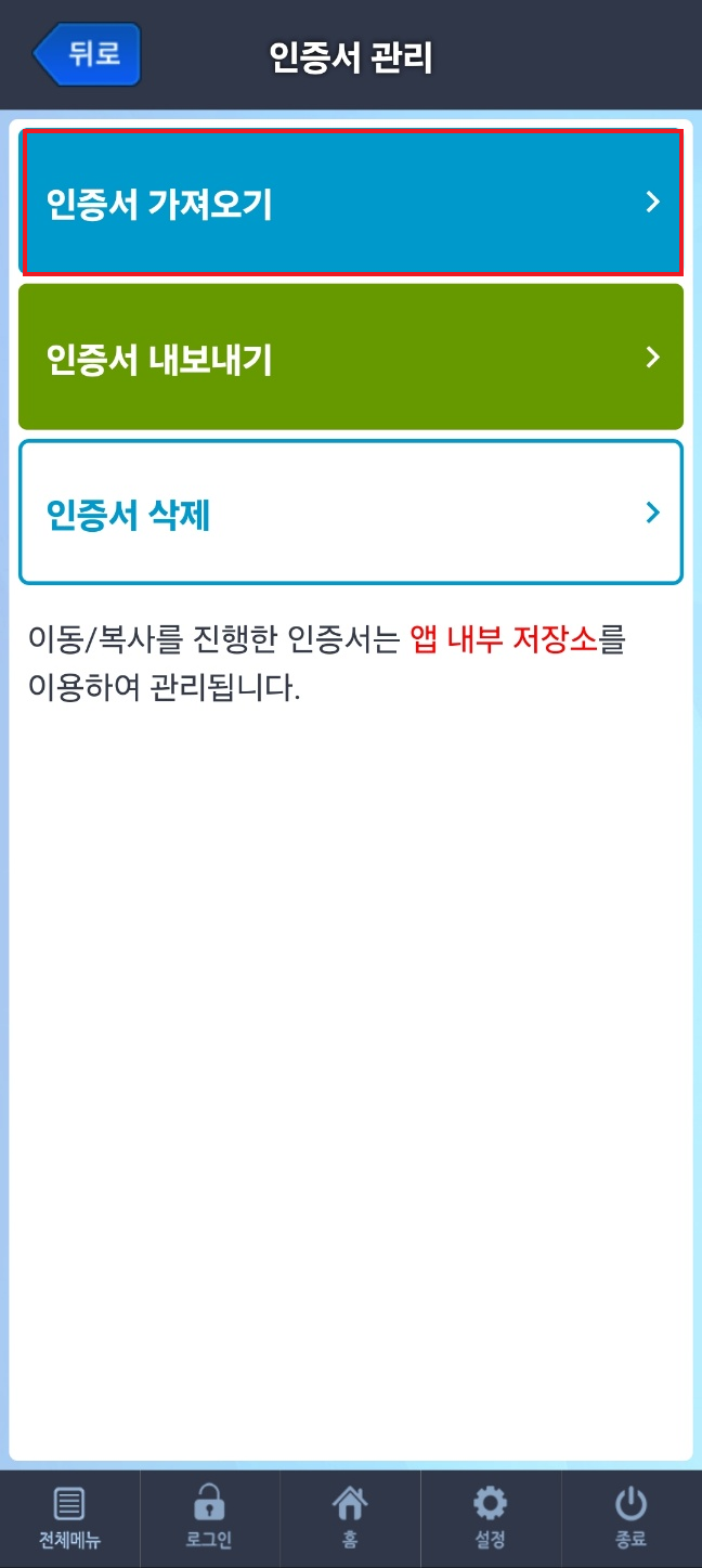 6. 「스마트나라장터」 앱의 좌측하단 '전체메뉴' → 메뉴 최하단 '인증서관리' → '인증서 가져오기' → 'PC에서 스마트폰으로 인증서 가져오기 진행' 클릭하고 PC에서 승인번호를 입력합니다.