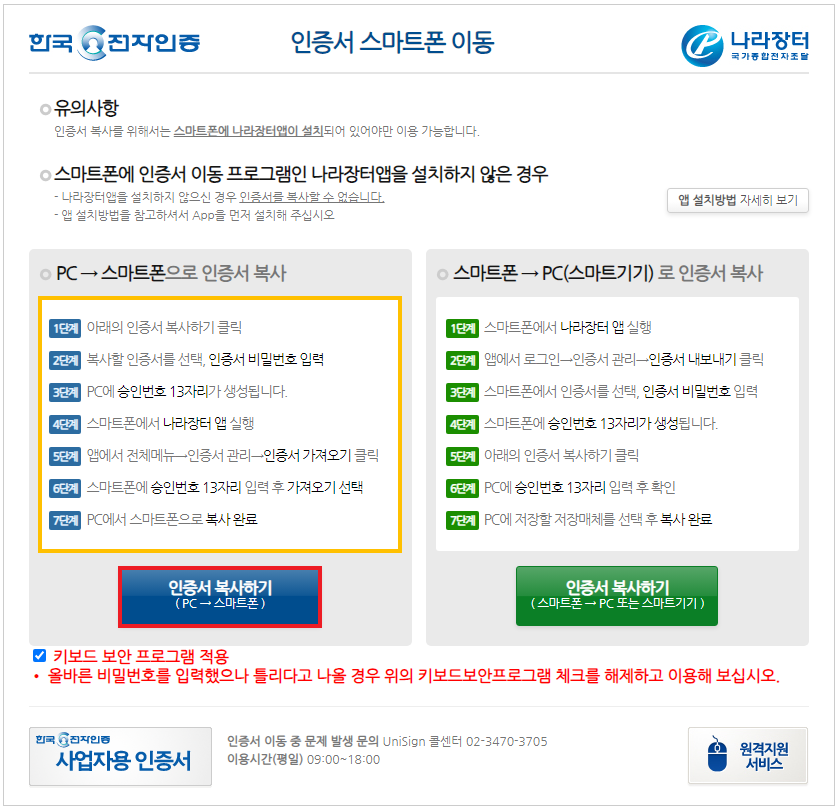 3. '인증서 복사하기(PC→스마트폰)' 버튼을 눌러 실행합니다.