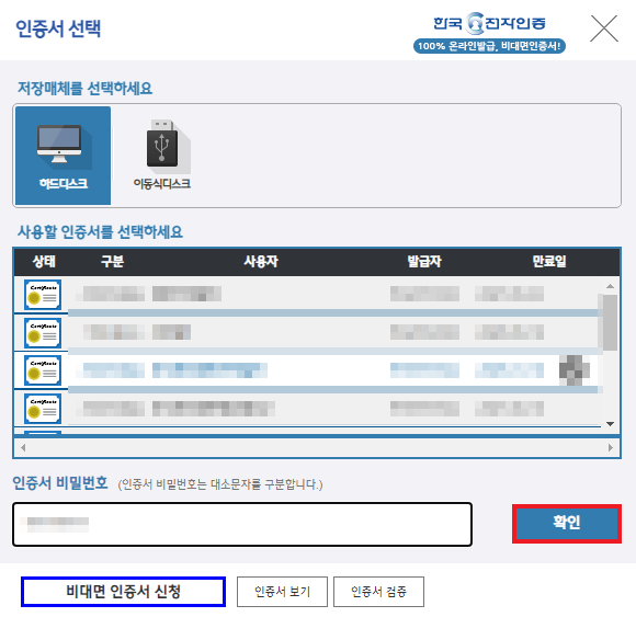 6. 해당하는 공동인증서를 선택하고 비밀번호를 입력합니다.
