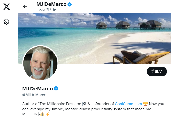 책의 저자 'MJ DeMarco'는 10살 때 우연히 길에서 본 람보르기니를 보고 꾸었던 꿈을 회상하며 글을 시작합니다. 글의 서두에는 대학을 졸업하고 온갖 아르바이트와 리무진 기사로 일하며 고생하던 중 10살 때의 꿈을 이루기 위해 리무진 예약 시스템을 만들어 부를 쌓아가는 과정에 대해 이야기합니다.