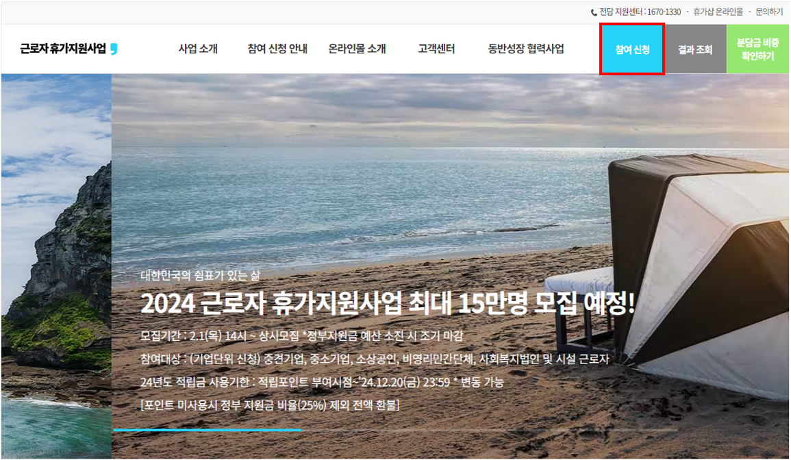 [기업]참여신청-> [공사]참여기업 확정-> [기업]기업/근로자 분담금 일괄 입금 및 근로자 정보 등 제출-> [공사]정부지원금 추가 적립 및 휴가샵 온라인 몰에 40만원 포인트 부여-> [근로자]휴가샵 온라인 몰에서 포인트 사용