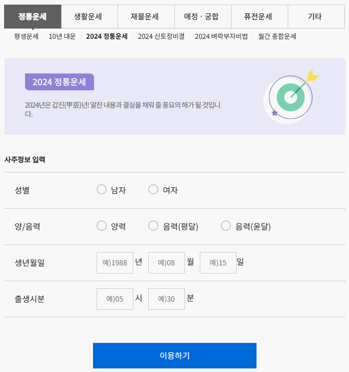2024년은 갑진년(甲辰年) 용띠 해입니다. 새해가 오면 지난해의 아쉬웠던 일을 털어 버리고 새로운 계획과 꿈을 꾸게 됩니다. 더불어 새롭게 계획하는 일이나 개인, 가족의 운세, 건강과 재물운, 애정운, 토정비결, 사주를 확인하게 됩니다. 많은 곳에서 무료 운세를 제공하고 있으며 대표적인 무료 사이트를 소개하고자 합니다.